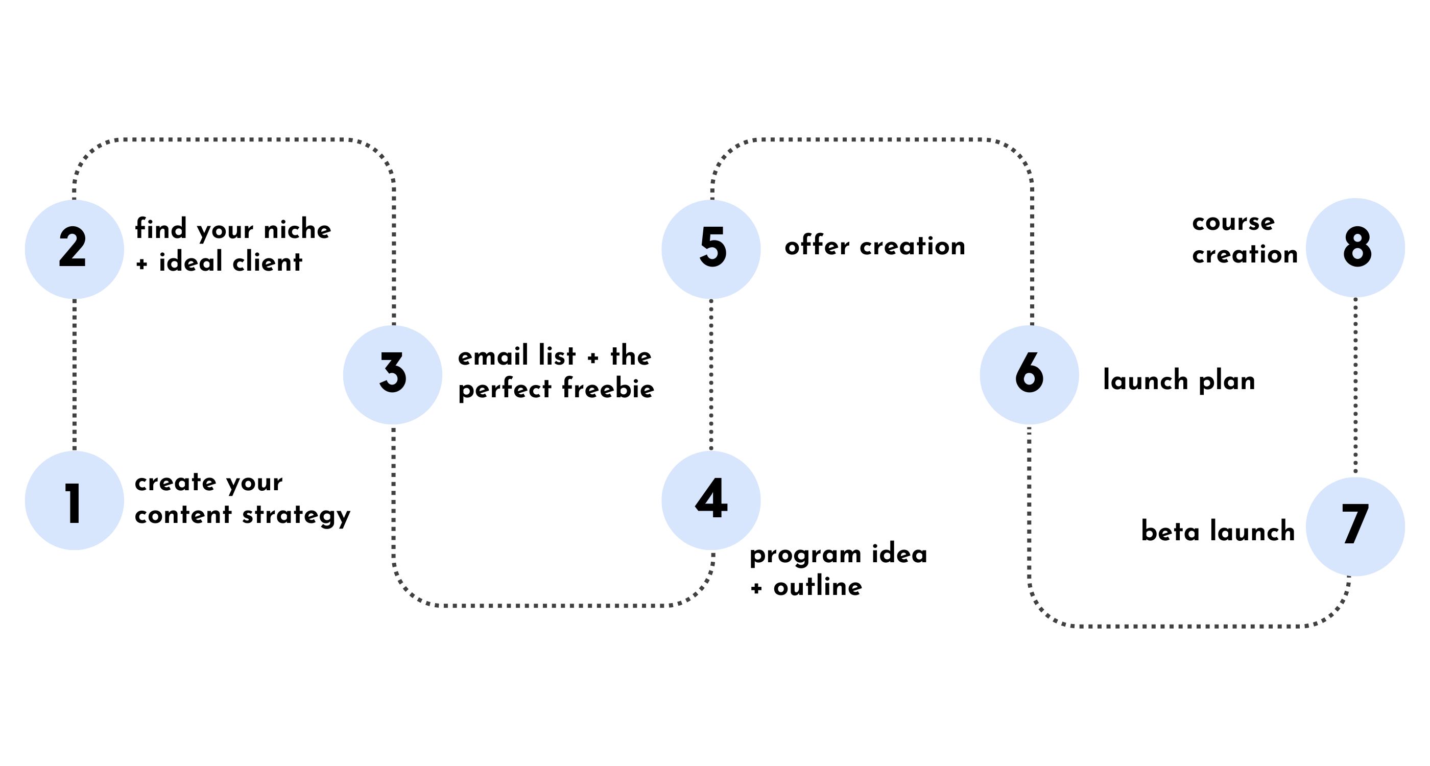 These are the building blocks of your digital product business (add to that many mindset shifts you’ll experience throughout the program, the things you’ll automate so you can make repeat sales and earn passive income, and the value you’ll provide by serving your audience).