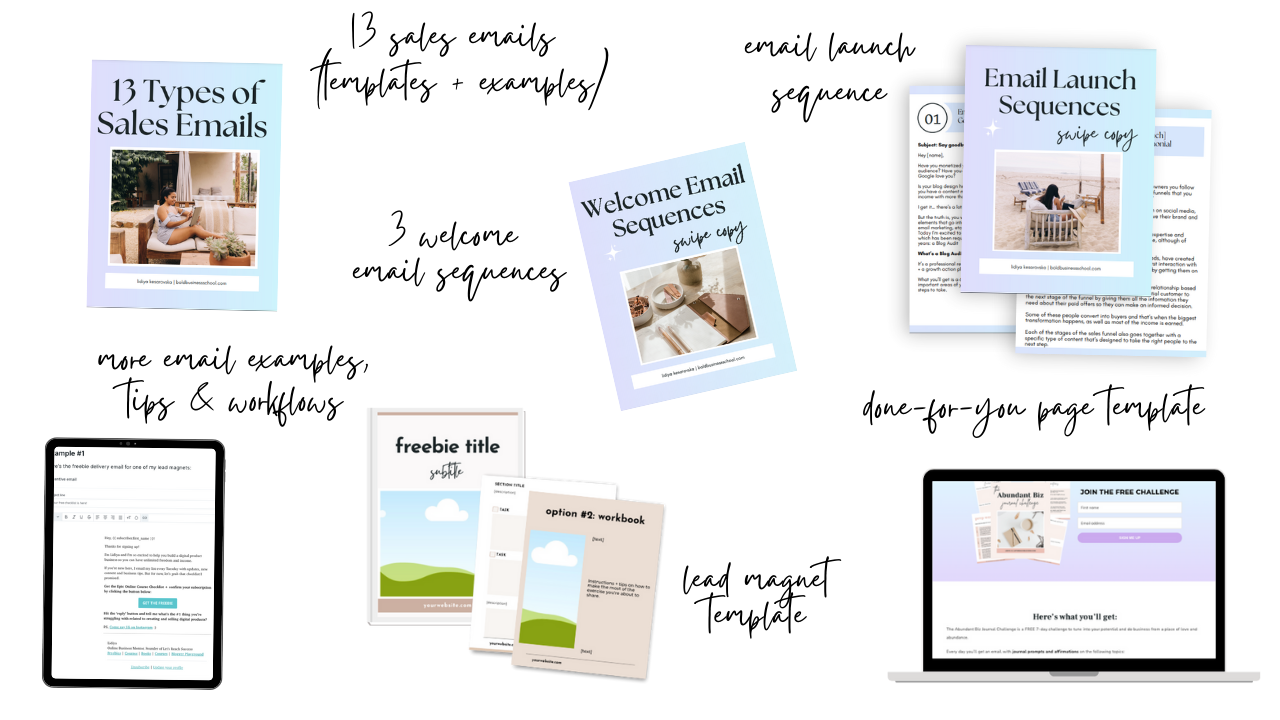 Whether it’s to actually set up your list, create your freebie, set up the freebie delivery email, write your welcome sequence, craft better sales emails, or decide when to send newsletters or what to write in them, you’ll find material inside the bundle that helps you with this.