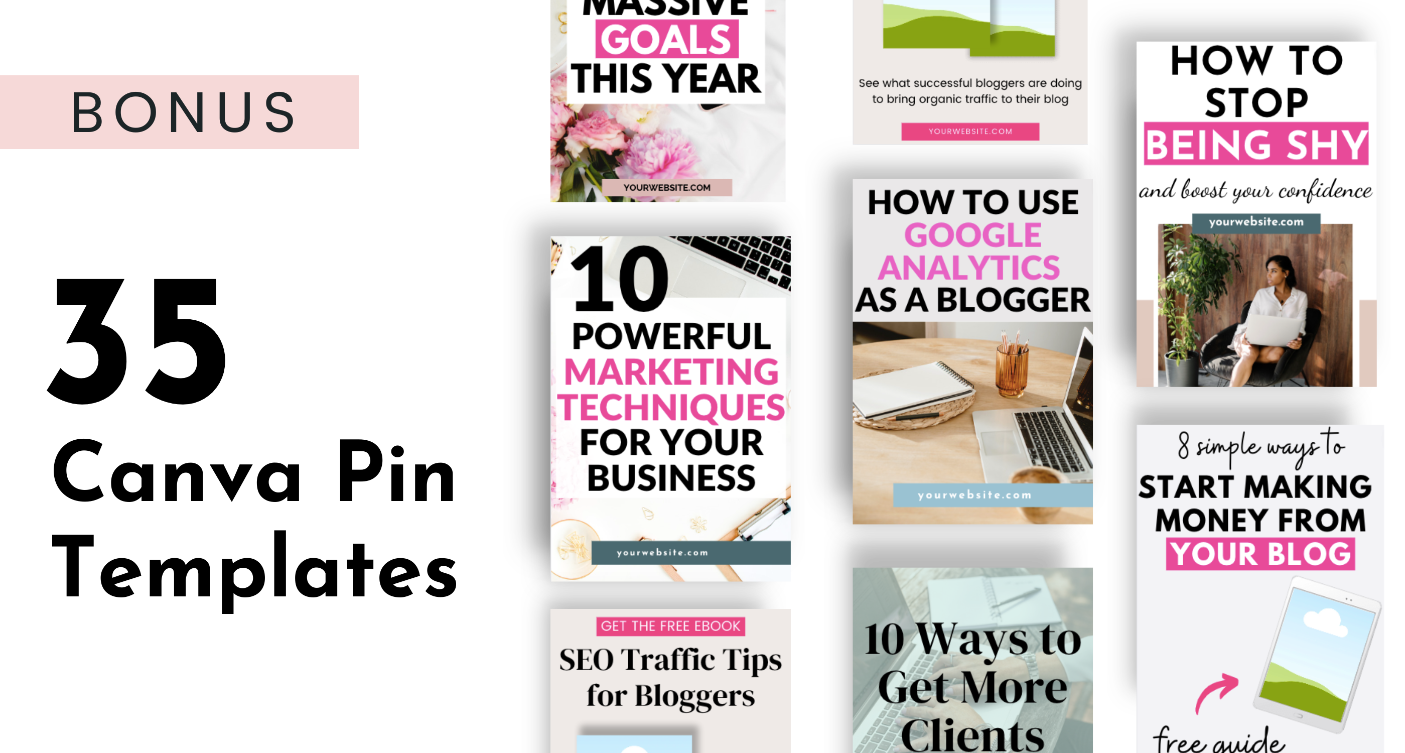 Once you enroll, you get immediate access to 35 Pinterest Canva Templates so you can create your own Pins in seconds instead of thinking of your own design and wasting hours.