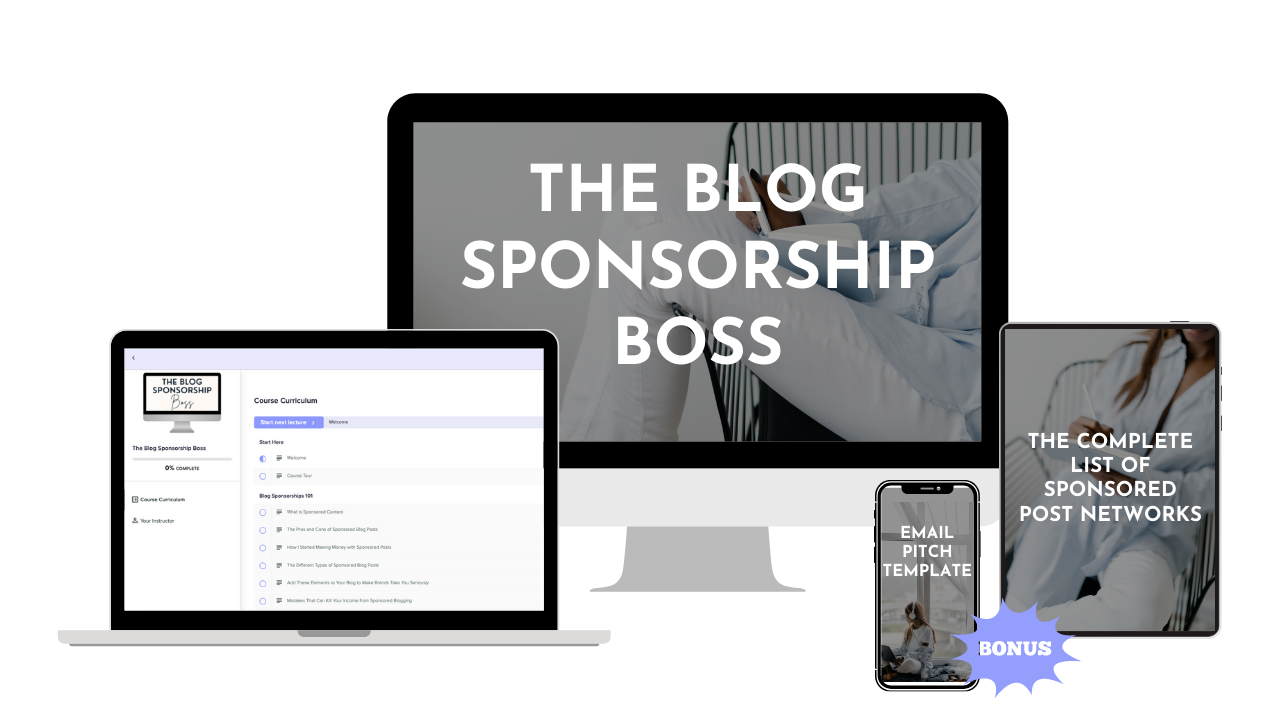 The Blog Sponsorship Boss is your one-stop shop for anything related to making money with sponsored content as a blogger (from making your site irresistible to brands and joining marketplaces that offer sponsored opportunities, to reaching out to brands yourself, negotiating your rates, and turning this into a regular income).
