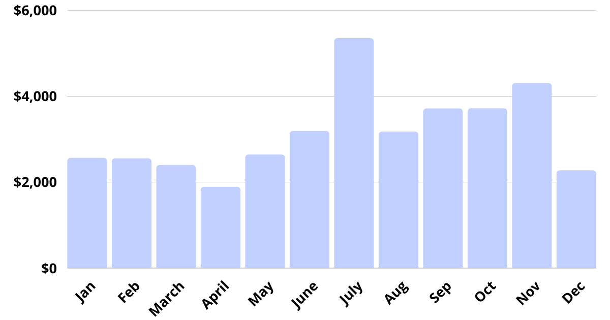 Below you can see how the monthly revenue from sponsored blog posts looked like in 2019, for example. That year sponsorships brought me a total of $37,723.